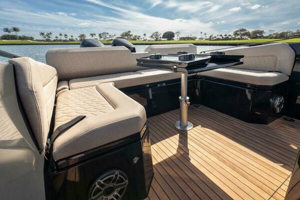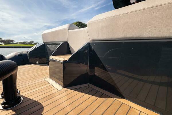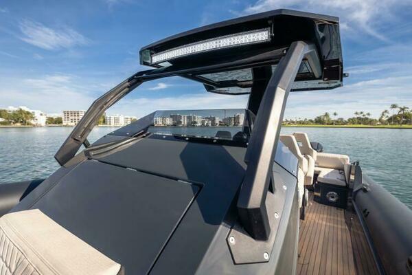 Electric bow and stern tables, carbon fiber dash, solid teak floors, freshwater washdown, wet bar with fridge, and full LED lighting package—including underwater, deck, and headlight LED bar.