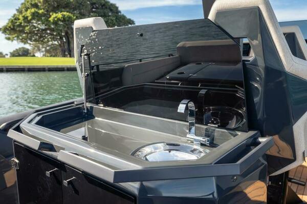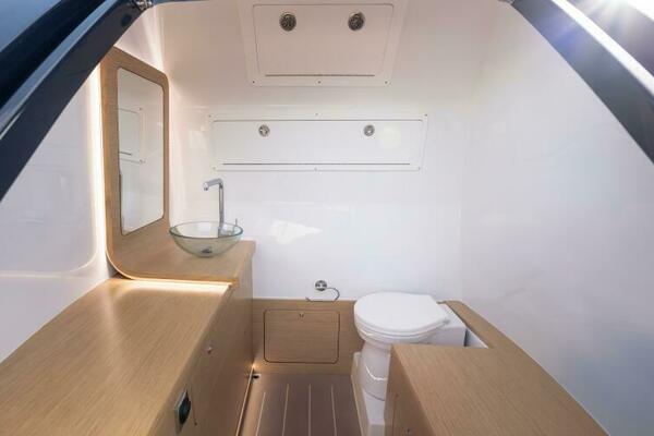 Spacious head with electric toilet, glass sink, and waste tank. Bow storage, second-row seating, and integrated battery charger with shore power.