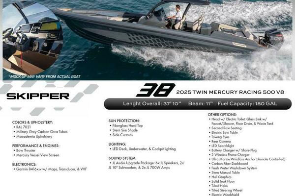 If you're the type of boater who demands performance, precision, and presence, the Skipper 38NC is built for you. Unapologetically bold and obsessively engineered—this isn’t just a RIB. It’s a lifestyle machine.