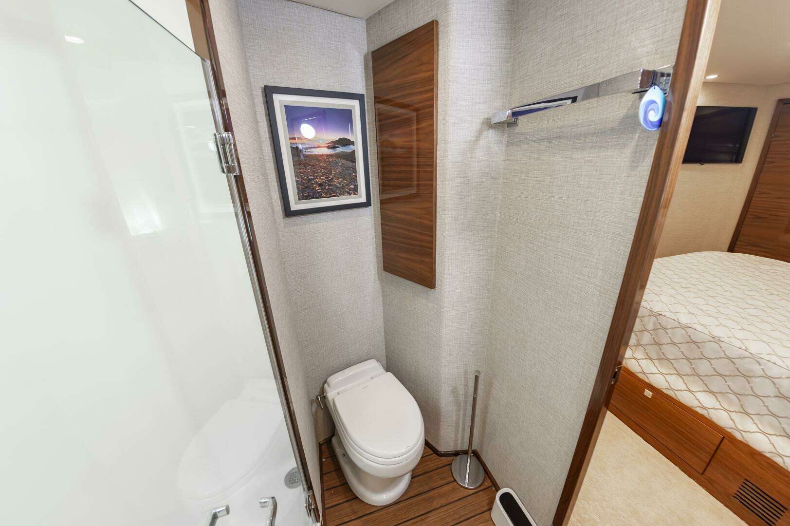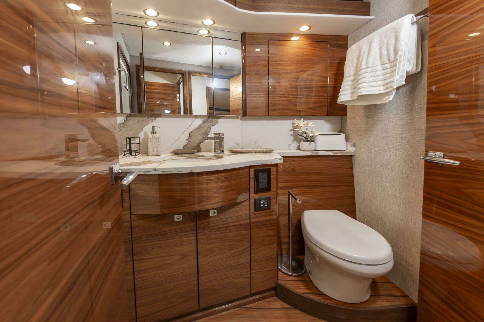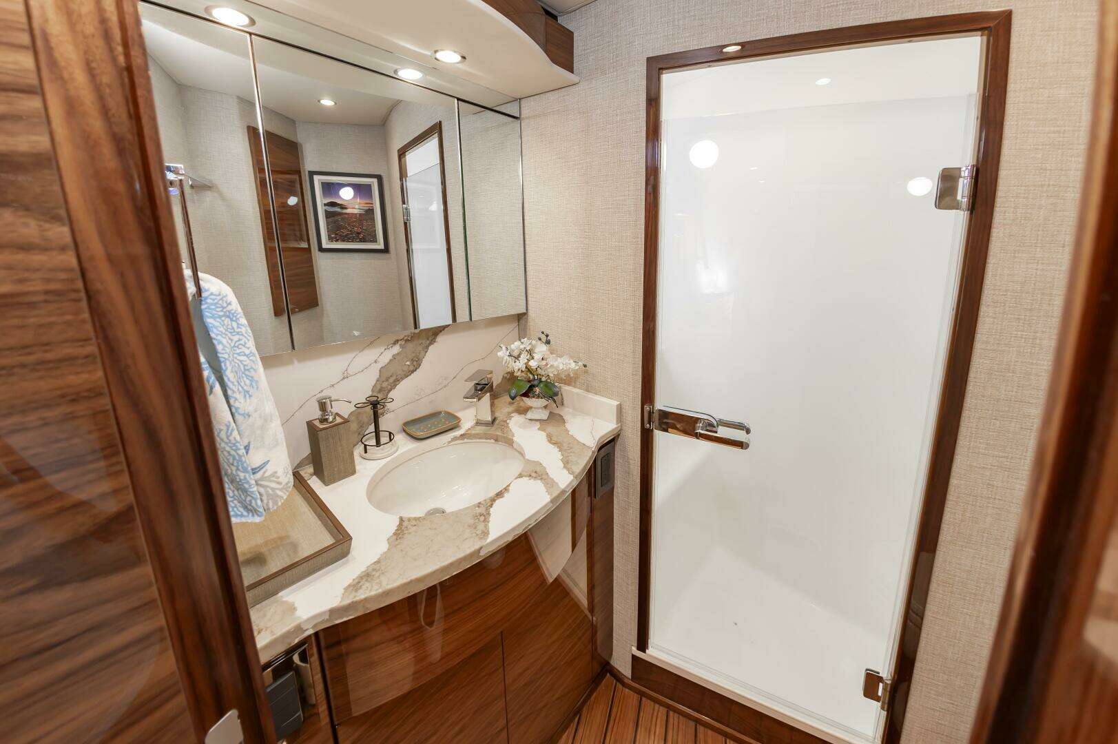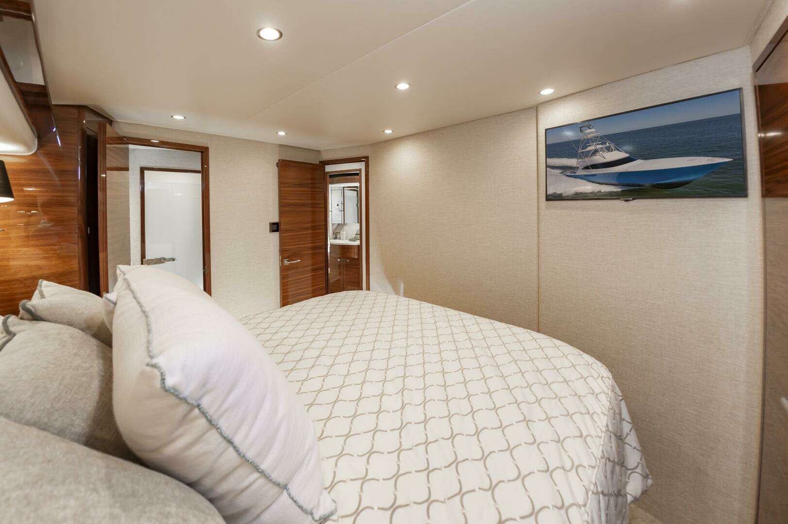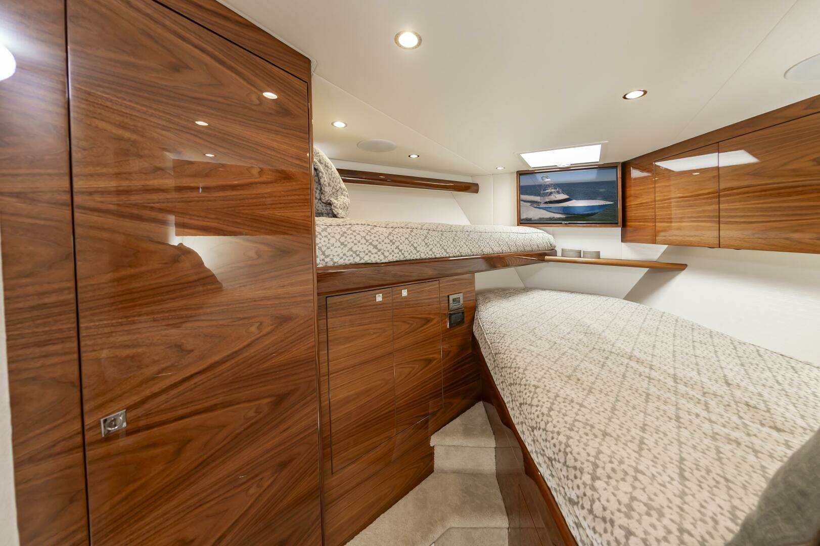 The "Simple Man" is a 2025 58 Convertible with three staterooms and two heads. Notable features include a tricked out Palm Beach Tower, a Complete Electronics package from AME including the Furuno CSH-10: 360 Degree Sonar, and desirable quiet and powerful 10cyl MTU power plant. Listed below below are some of the options which set this boat apart and make it the nicest 58 on the market. This boat has a very soft dry ride and cruises 32kts with a Top Speed of 41.