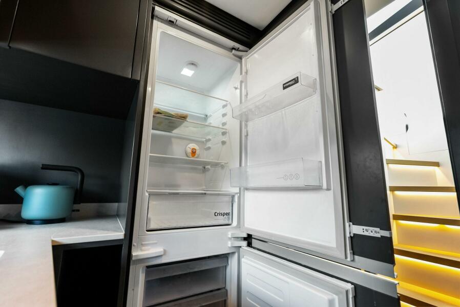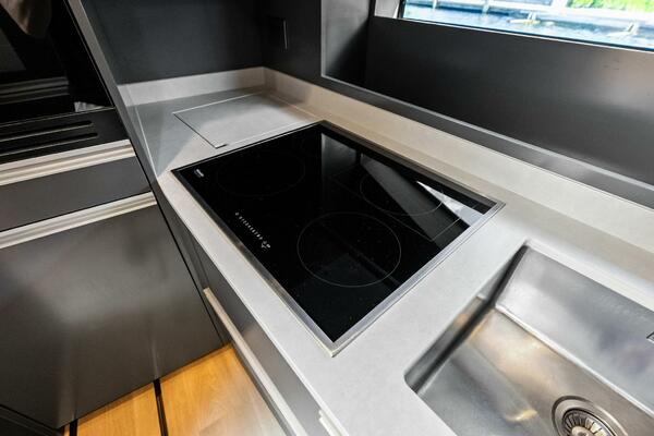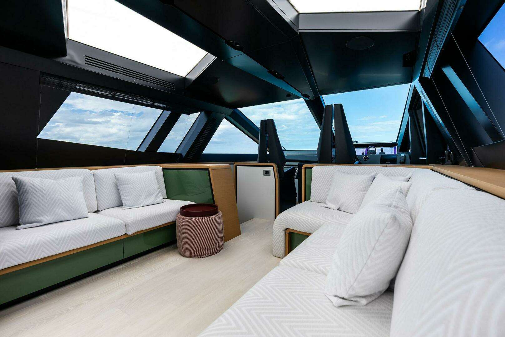 - The main deck blends saloon, dining, and helm spaces in a hybrid inside–outside configuration. Opening sides and aft doors allow you to transform it into an al fresco dining area or cozy movie lounge.