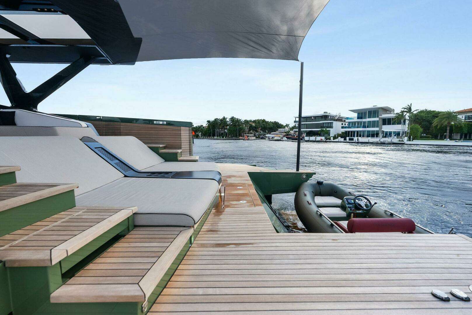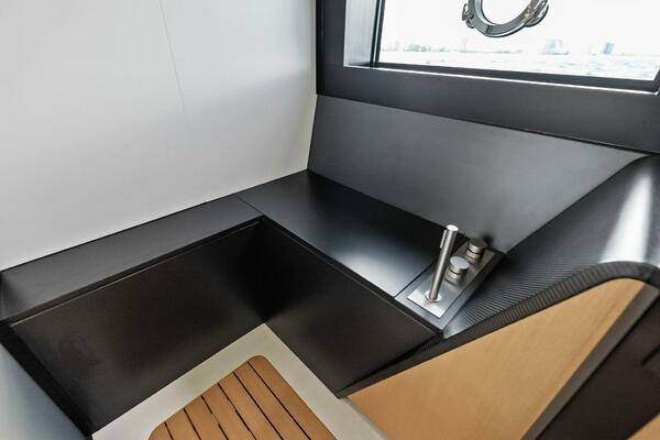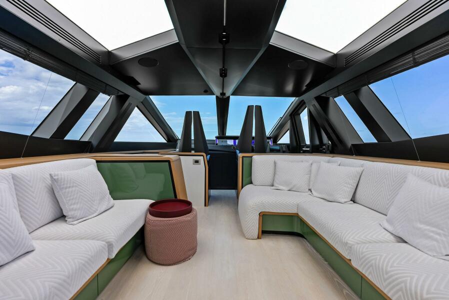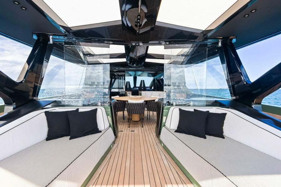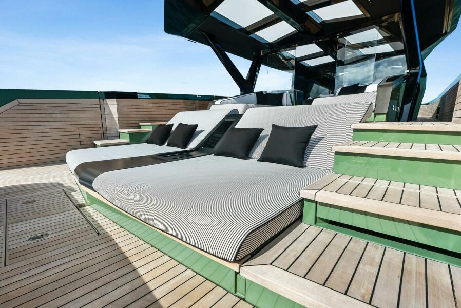 - The foredeck includes a convertible lounge that can serve as an aperitivo spot or sunbathing area.