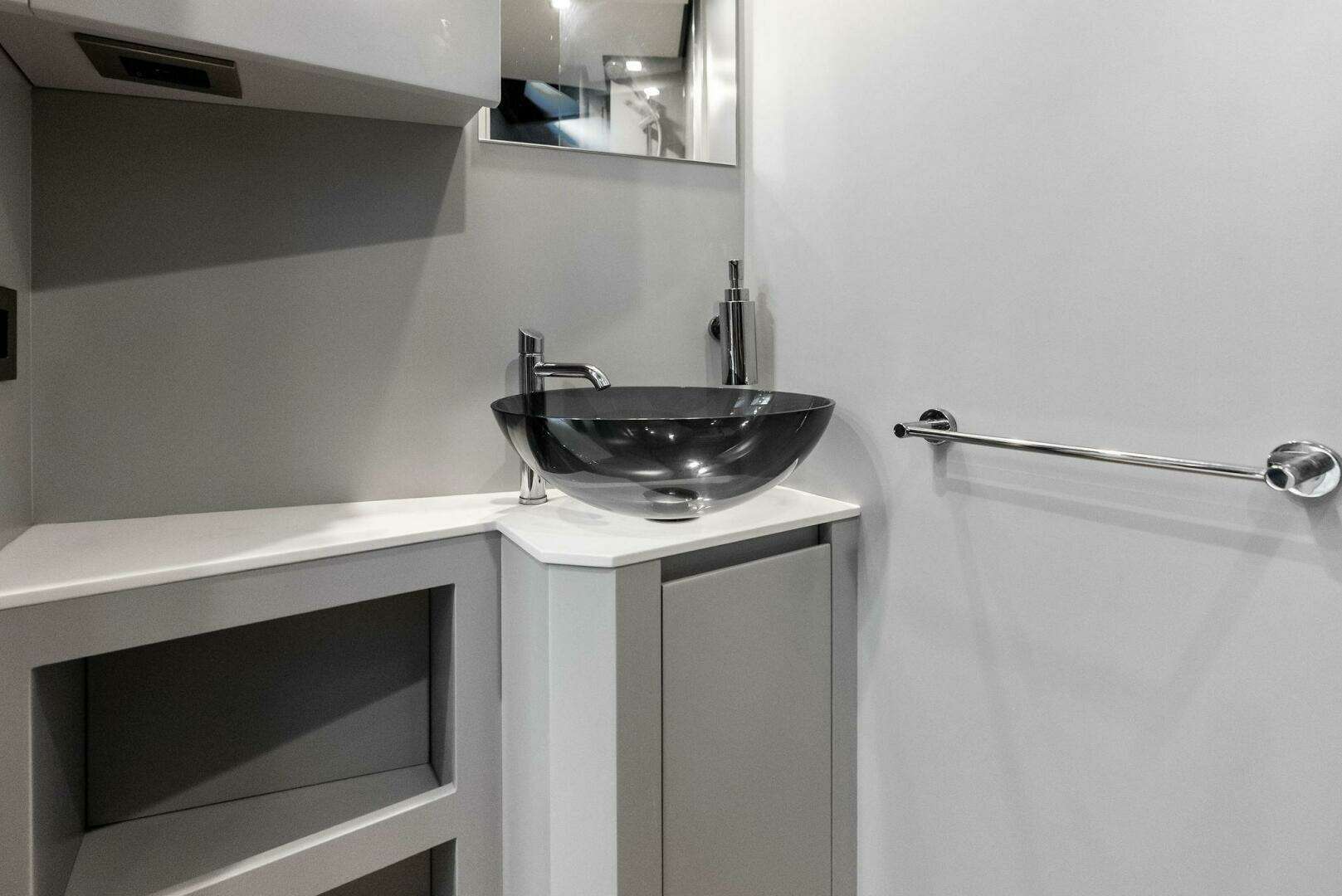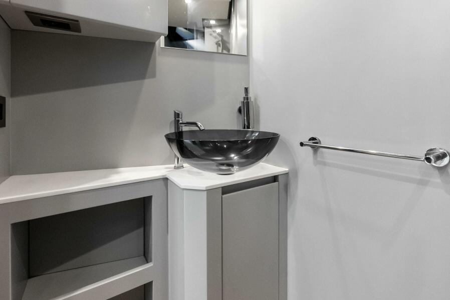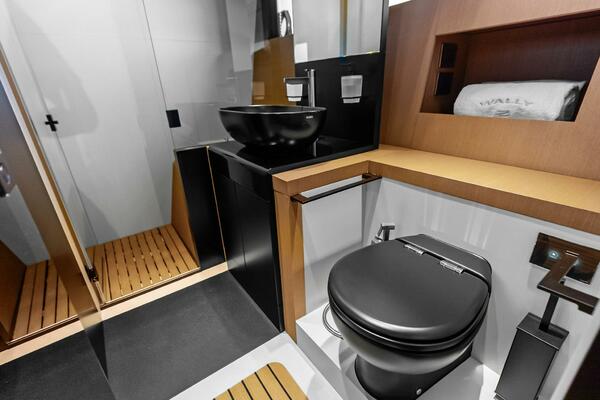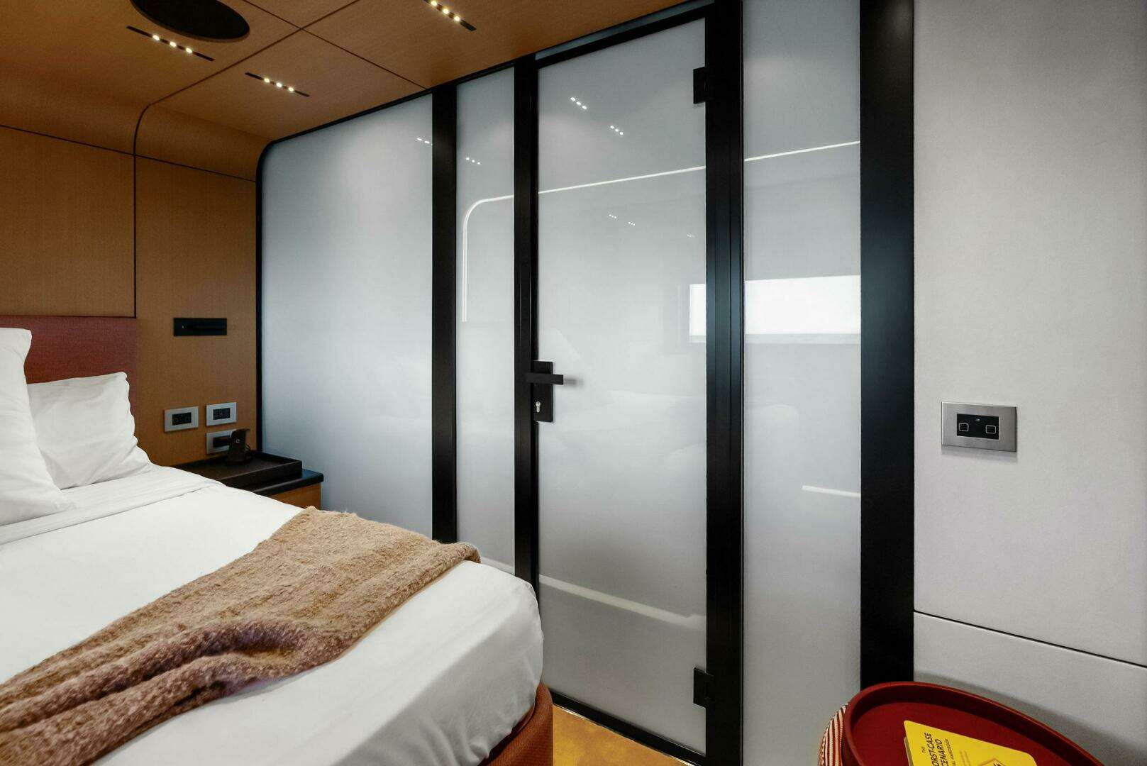 - The lower deck includes a full-beam owner’s suite amidships with an en-suite. featuring electrically switchable smart glass—transparent or opaque at the touch of a button.