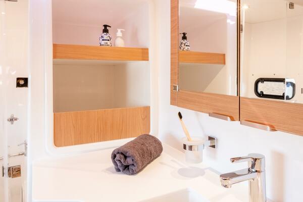 Inside, you’ll find a spacious salon, a full-sized galley, and generous cabins—each with ample storage and en-suite bathrooms. The signature solid forward deck features a large lounge area perfect for sunbathing or evening cocktails, while the flybridge provides 360-degree views for navigating or simply relaxing.