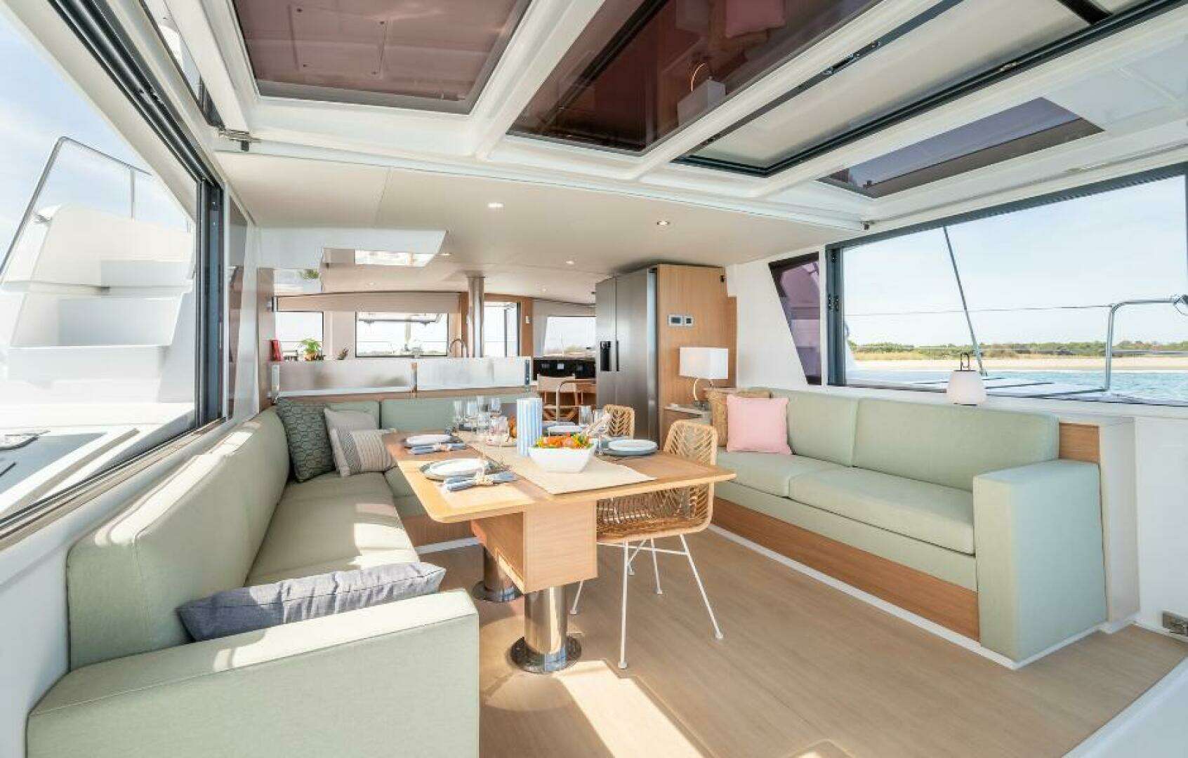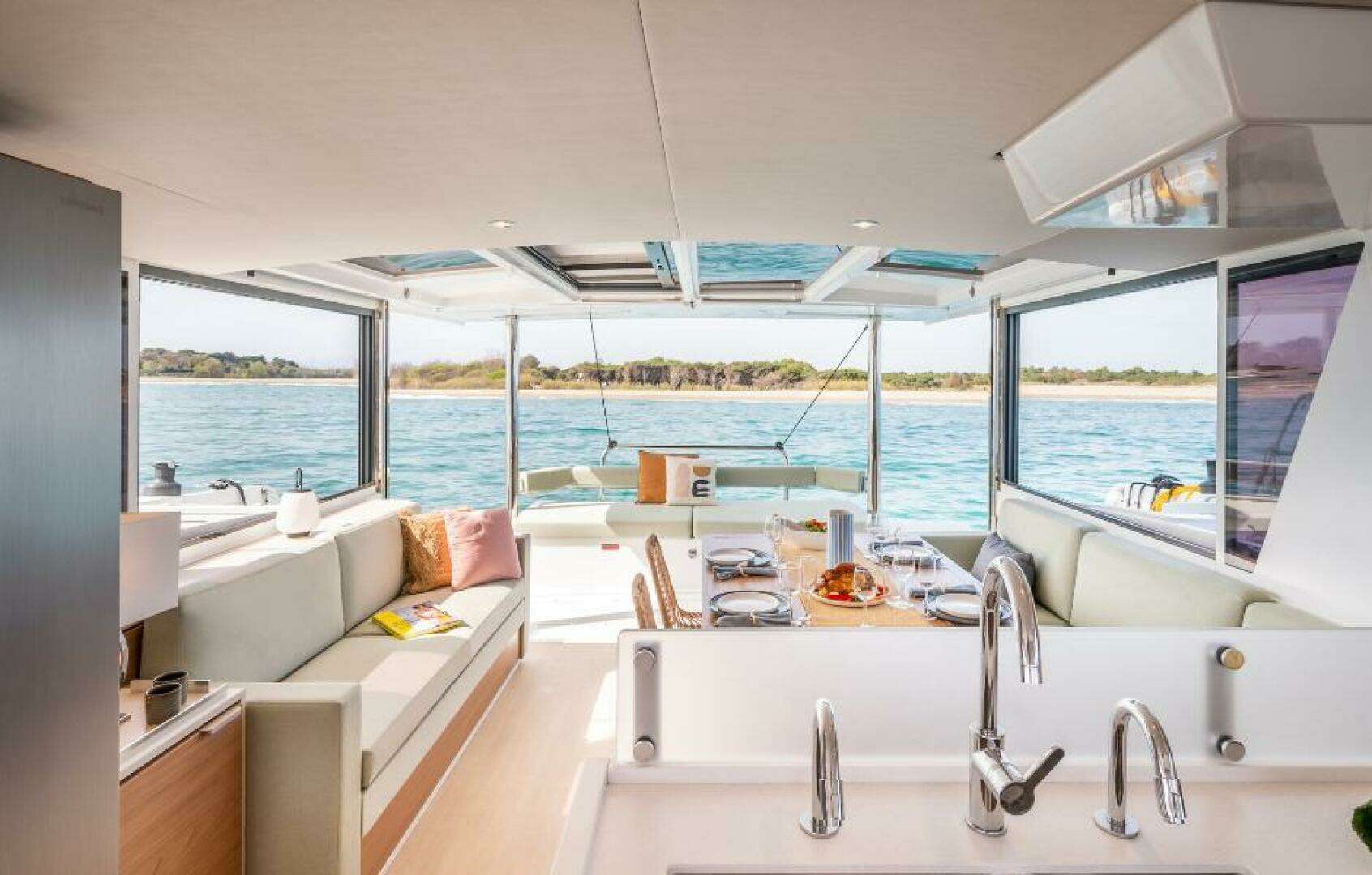 Even completely open-plan, each interior space is perfectly defined. The large “L” shaped kitchen, the maxi saloon/ lounge for 10 to 12 guests and the large chart table are models of ergonomics and comfort. The decoration is warm and refined. A totally open space bathed in light with panoramic sea views!
