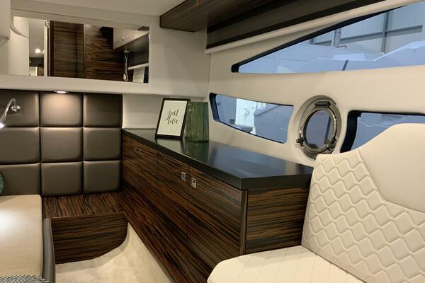 - Performance & Handling: Bow and stern thrusters, joystick piloting (Mercruiser or Volvo), ZipWake automatic trim system, and upgraded navigation with radar, chartplotter, and VHF.