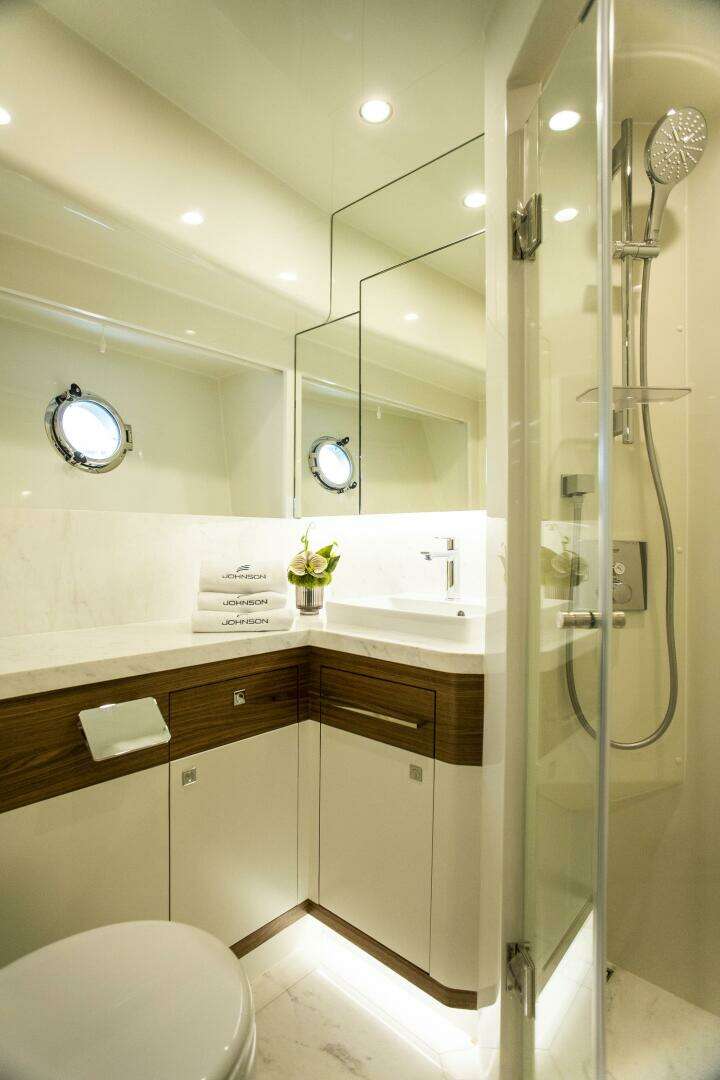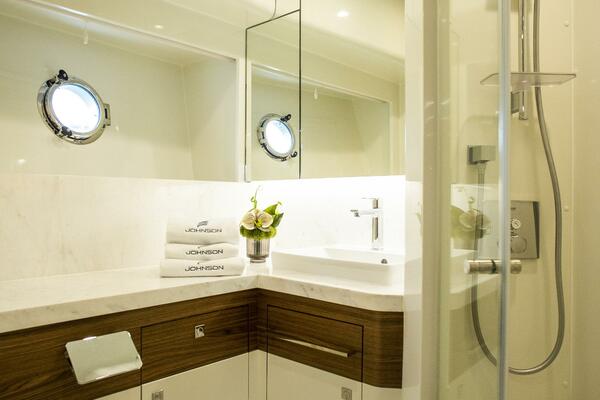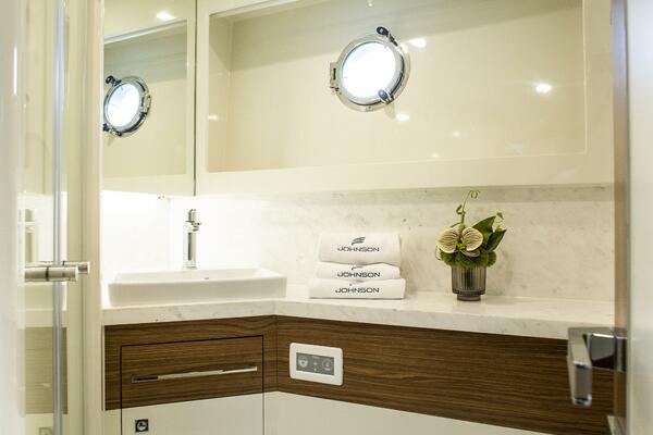 Performance statistics, weight, draft, freeboard and height are estimated only and are not warranted, and actual figures will vary depending on tolerances achieved during the vessel’s construction process and the equipment, supplies and stores on board, as well as operational and sea conditions. Johnson Yachts reserves the right to substitute equipment and materials stated herein to others which it believes to be of equal or superior quality and to make such design and dimensional changes as it believes are necessary to improve the vessel’s performance and function. Special treatment of interior fit-out and/or use of non-standard soft furnishings required by the purchaser may be subject to additional charges.