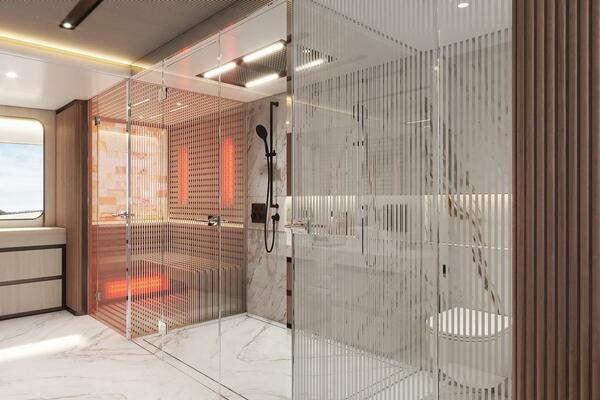 Luxury meets boundless blue with 13 square meters of infinity plunge pools that blur the lines between the yacht and the horizon. Positioned at the stern with glazed walls enhancing the visual drama, these pools create an immersive oceanfront experience.