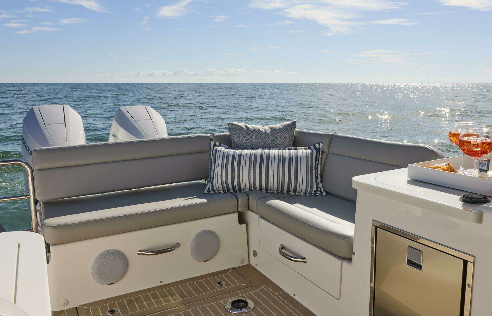 She delivers exceptional and unmatched smoothness and stability in her ride. Thanks to our market-leading post-cured Epoxy infusion composites process and advanced hull geometry, the MJM 3 is praised as the best handling day-yacht in her class. She can handle inlets and conditions that would return all other boats to the dock. Equipped with cutting-edge digital fly-by-wire technology and twin Mercury Verados, the MJM 38X ensures quiet and precise navigation with joystick piloting, Skyhook station keeping, low maintenance costs, easy pre-flight checks, and the added excitement of shallow water exploration.