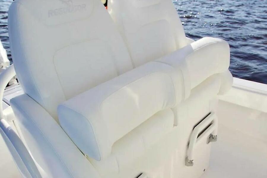 • Deluxe Tackle Center with Upholstered Helm Seating for Two with Flip-up Bolster, Individual Footrests, (4) Seatback Rocket Launchers, (2) Cup Holders, 32 gal. Livewell, and Tackle Storage