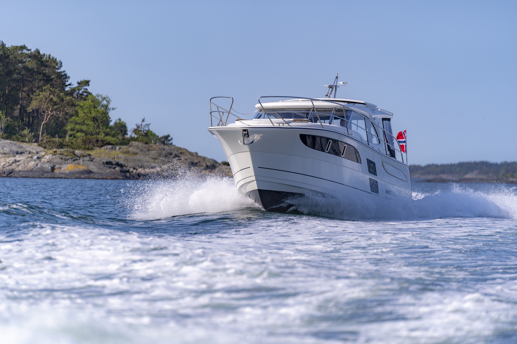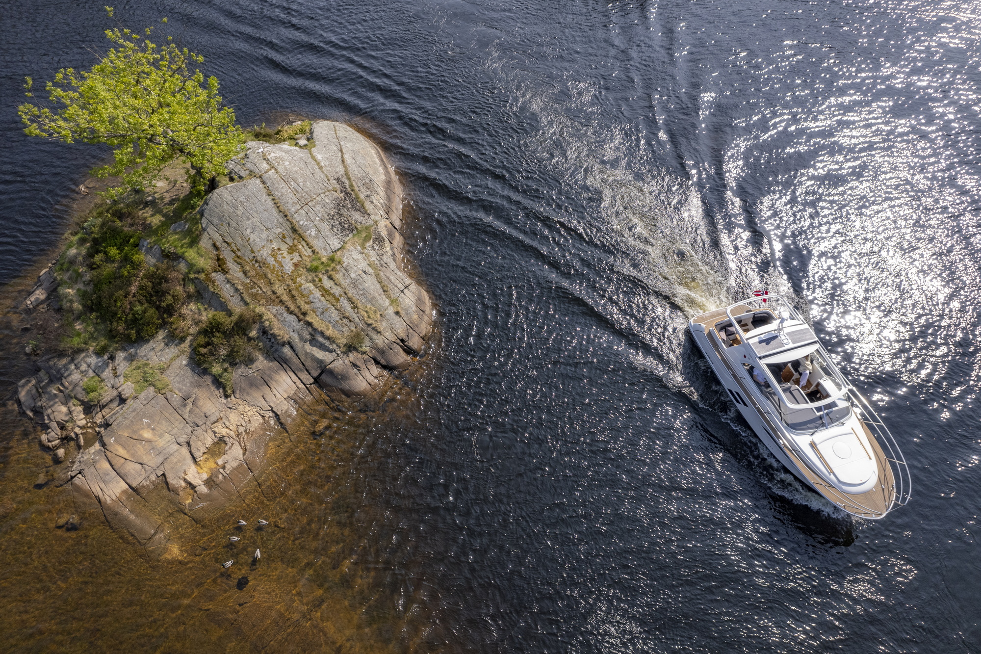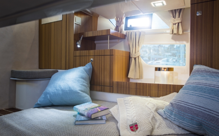 Measuring in at a compact 9,46 metres in length, the 310 Sun Cruiser features a spacious cockpit/salon area. The extensive wrap-around seating is organised around a large folding table, in the centre of which are handy drink holders. With a forward-facing co-pilot sofa, the 310 is an enormously enjoyable way of cruising with up to 10 guests. Also, it’s possible to lower the dining table and easily convert the benches to create a perfect sunbed for a sunny day or a sleeping berth for extra guests. Another sunpad can be found on the foredeck. The expansive side decks with high rails lead safely to it. Smart canopy solution The cockpit canopy solution is the most exciting and innovative detail distinguishing the 310 Sun Cruiser from similar pleasure boats. It is the world's fastest system, which allows the side curtain to be closed quickly by pulling it out from the side vertical compartment. This will enable guests to quickly open the cockpit to the sun or close it in a sudden rain while prolonging the boating season. In addition, two sliding sunroofs over the cockpit can be opened or fixed in several positions, providing the necessary level of shading/sun.