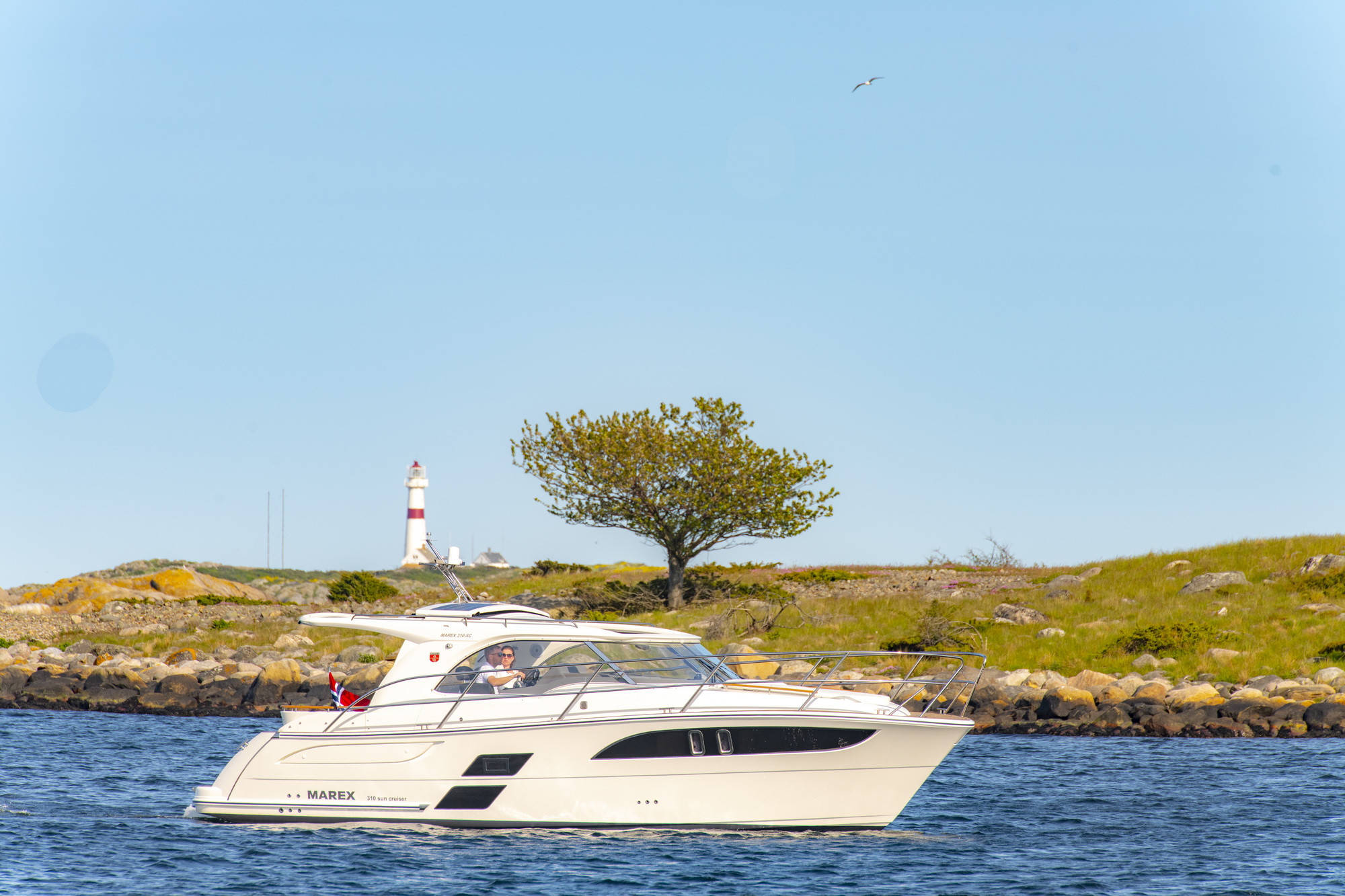 There are two cabins on the lower deck with spacious double beds up to 5.3 Ft. wide and wardrobes. Large hull windows provide natural light and the feeling of space. Thanks to a large, well-finished bathroom, all guests will have high on-board comfort. Propulsion and helm The boat has a planning hull and is equipped with a single sterndrive. A Volvo Penta D4 300 HP diesel engine, ideal for calm waters and rough sea conditions, powers the standard version of the 310 Sun Cruiser. Marex also offers more powerful engine options, such as the D6-370 EVC or alternatives from Mercury with additional smart electronics. The 310 Sun Cruiser features an ergonomic panel equipped with a large chartplotter. Here, the captain's seat can be adjusted depending on the need to drive standing or sitting.