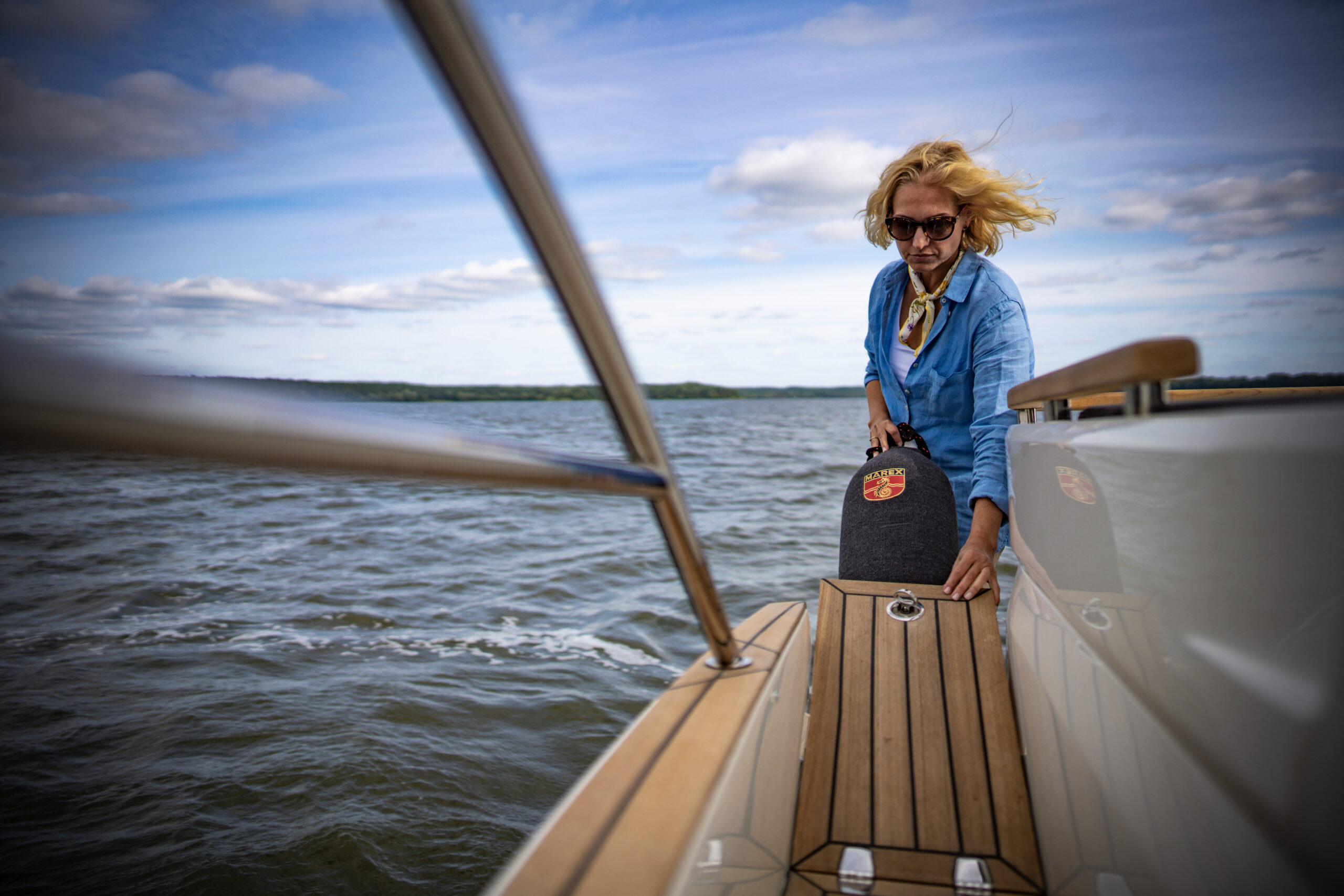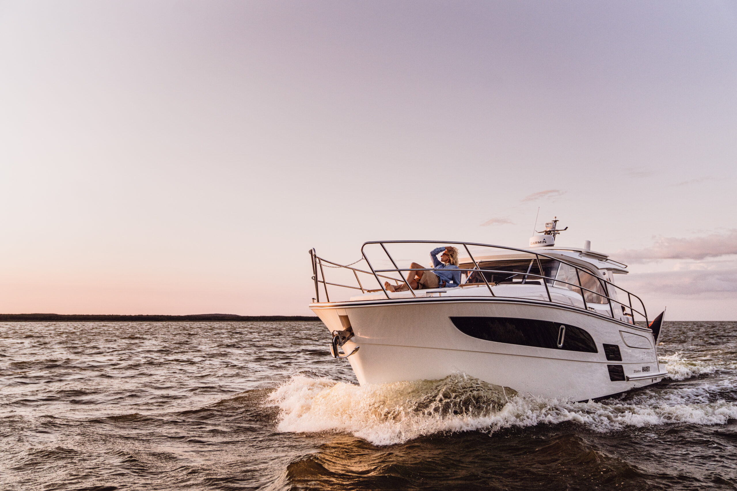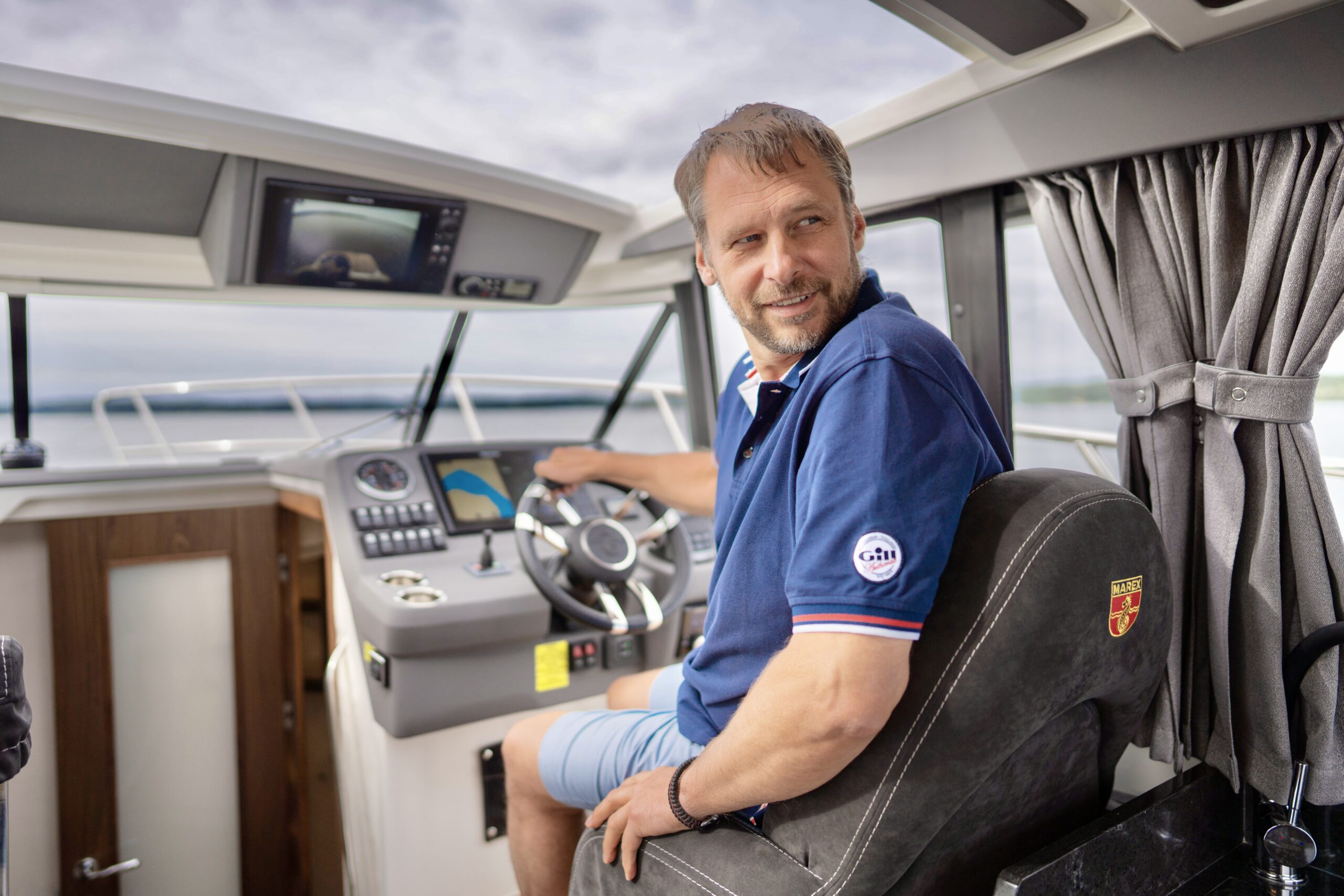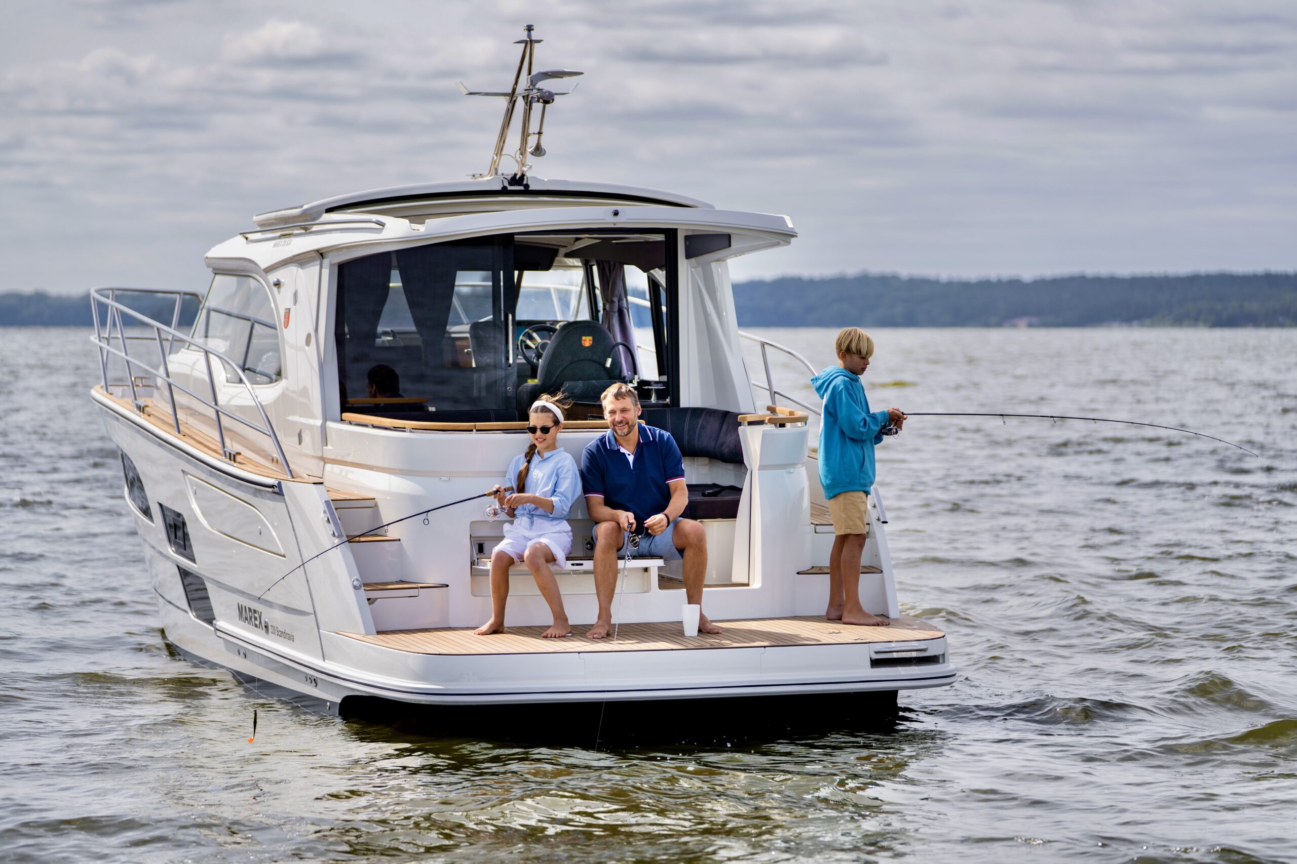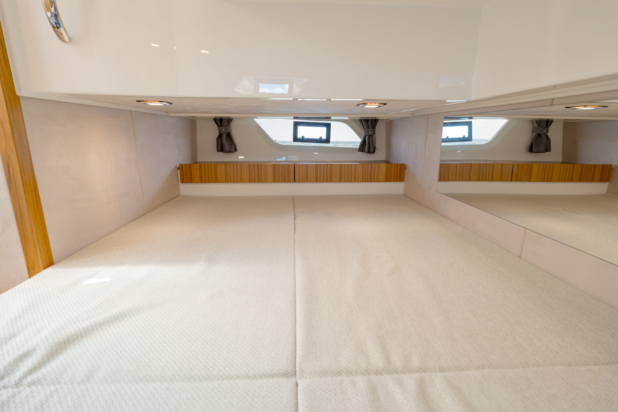 Solar panels of up to 900 watts can be installed on the roof. These produce enough power to run the fridge and a freezer, allowing the owner to stay away from shore power for a long time. This solution has been used several times on Marex boats and has proven itself. Still, the bicycle, paddleboard, or kayak rack on the hardtop is debuting on the 330 Scandinavia. Another innovation is a multifunctional sunpad on the foredeck. It can double as a floating water toy, creating a private beach for the whole family to enjoy. The 330’s helm features an extended dashboard and has become more skipper-oriented. Two Simrad touch screens provide all necessary information and are easily viewed, regardless of whether the skipper is sitting or standing. A special note is an additional sliding door that opens to the starboard passageway. With a quick movement, the skipper can step out from the helm to facilitate mooring. As a result, docking and handling without a crew has never been so easy.