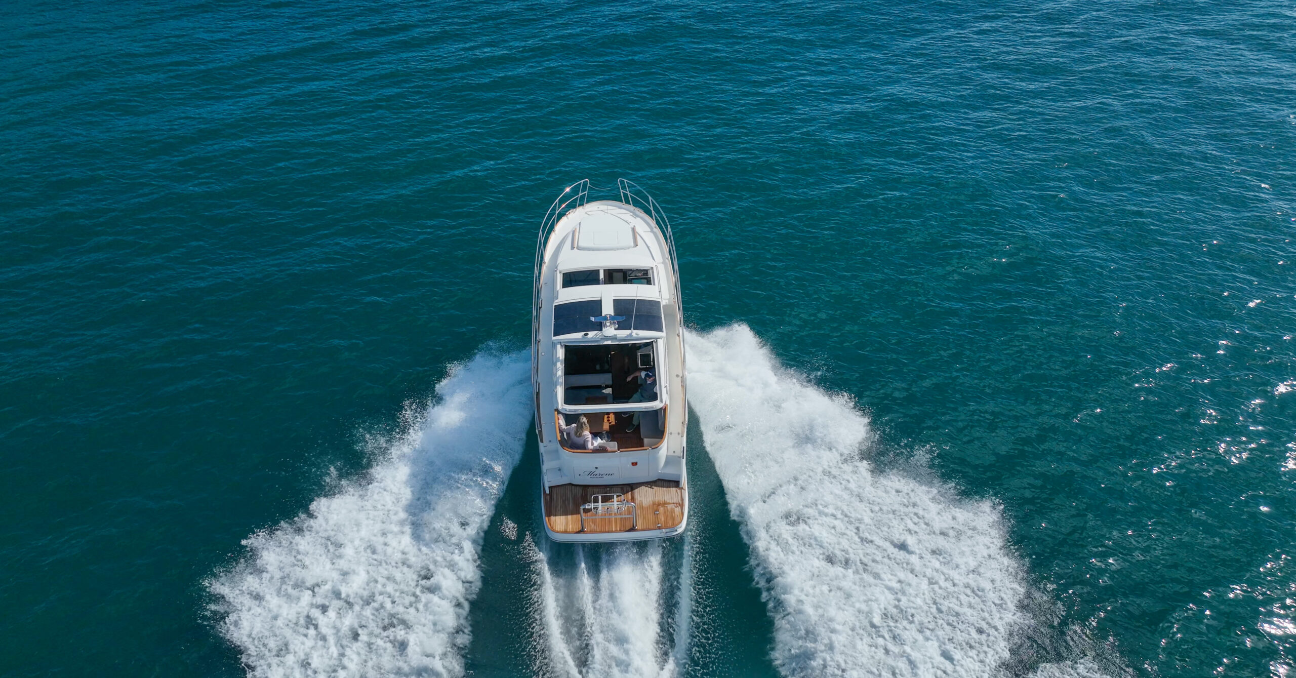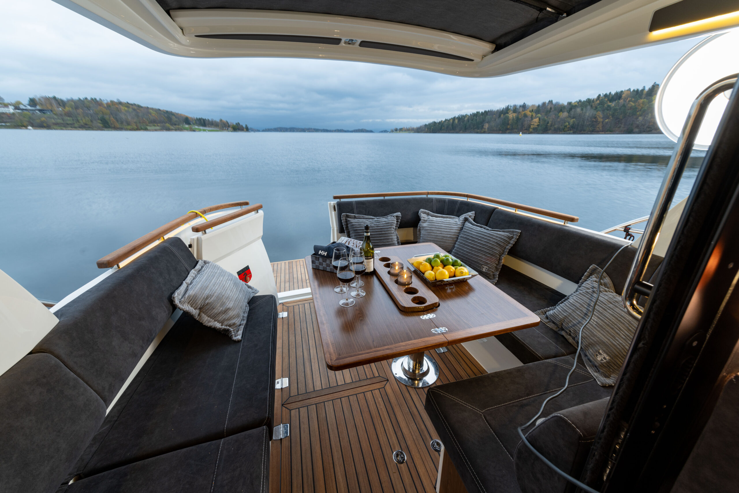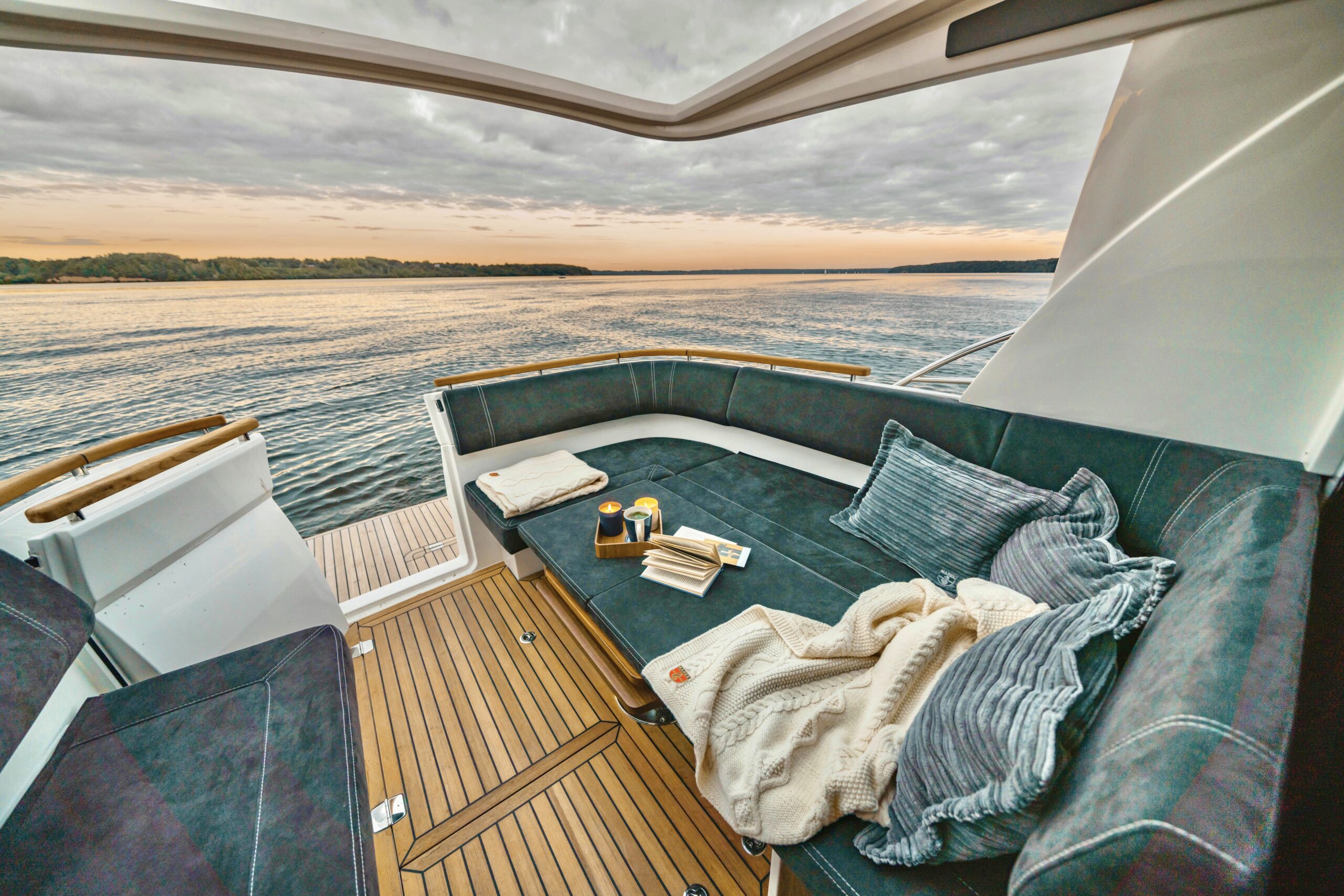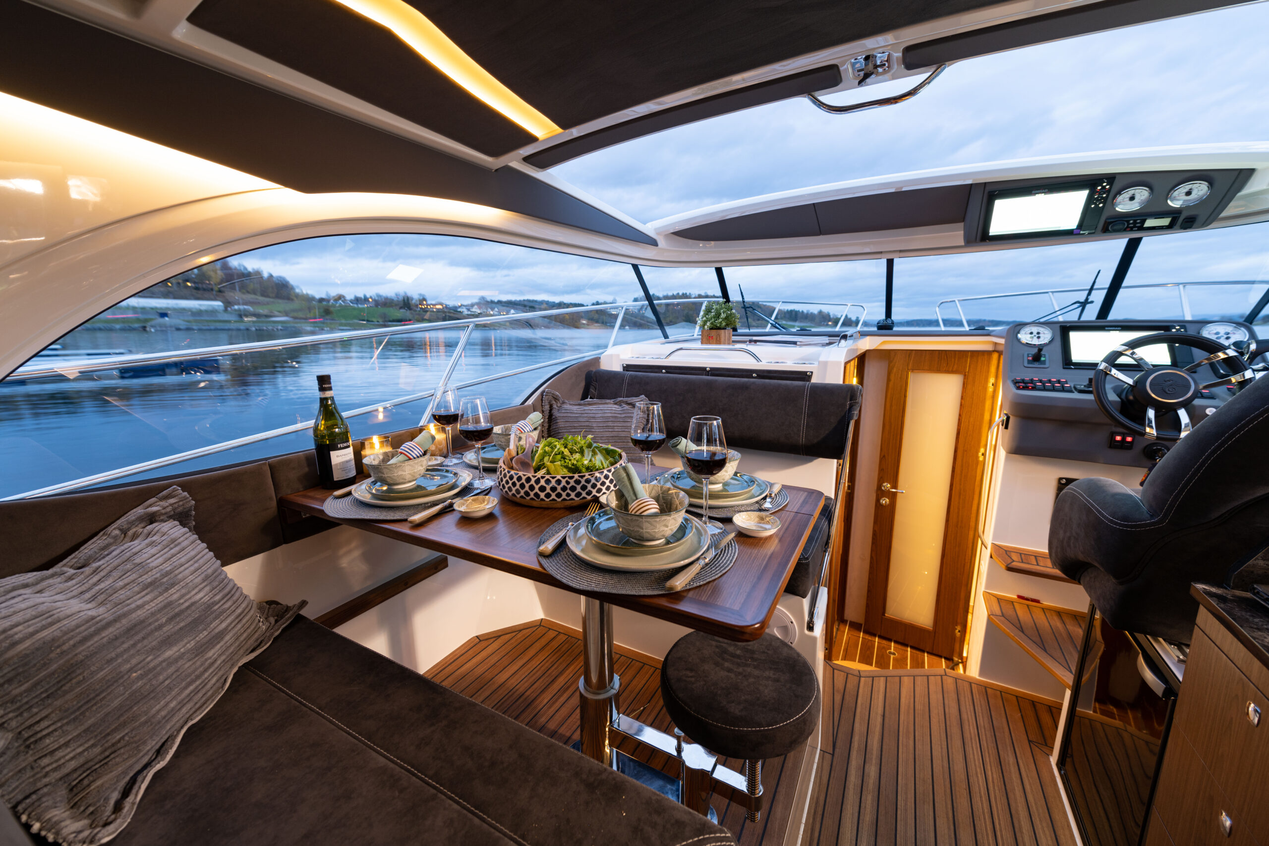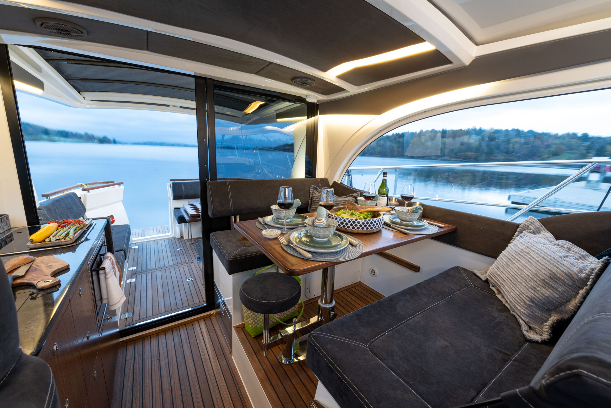 Safety and practicality At 33 Ft. in length, the Marex 330 Scandinavia offers many practical solutions onboard. For example, a folding bench is built into the deck at the stern. Guests can sit with a fishing rod, take a breath after the swim, and use the deck shower behind the seat. Also, Marex has designed an innovative fender storage solution, so no wet fenders are stored in the cockpit but along the side passages. For enjoying swimming and bathing, a flip-out ladder is built into the swim platform and concealed by a teak hatch. There is a reason why the 330 Scandinavia won the Best Family Boat award. Safety and the feeling of security dictate all decisions here. The side walkways are wide enough to move comfortably without feeling constrained, and the protective rails are raised to a sufficient height. Open or coupe? The cockpit on the Marex 330 Scandinavia features a social layout. The U-shaped sofa and dining table easily accommodate 6-8 people. The table can double in size and has integrated cup holders in the middle. Make Marex’s possessiv advanced Canopy Solution. The updated single-mount system allows the quick fastening of the cockpit canopy. The side curtains and roofs can be entirely closed in less than a minute. This user-friendly innovation helps to extend the summer season in Northern areas (using a heater) or makes boating more comfortable in warm climates (with AC). This is especially valuable because the salon can be combined into a single zone with an open area thanks to the sliding patio door. A grill can be installed in the cockpit, but the main galley is in the salon and features a sink, cooling box, fridge, induction, and an electric stove. On the opposite side are two sofas, a folding table, and an additional pull-out stool. With one easy movement, one of the sofas can be turned from the dinette seat into a co-pilot navigator bench. The flip-over backrest is a clever way of expanding the Marex salon's practicality and usable space.