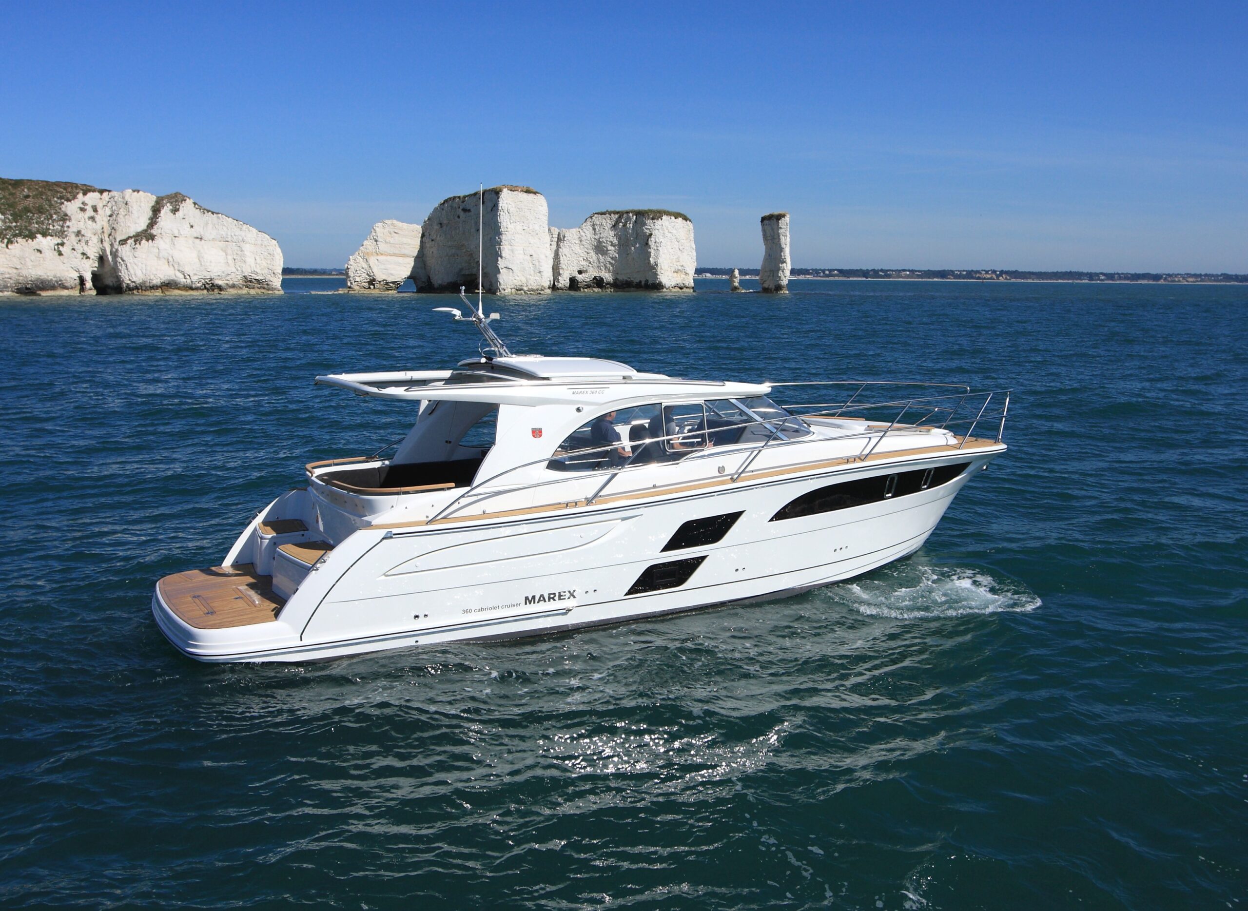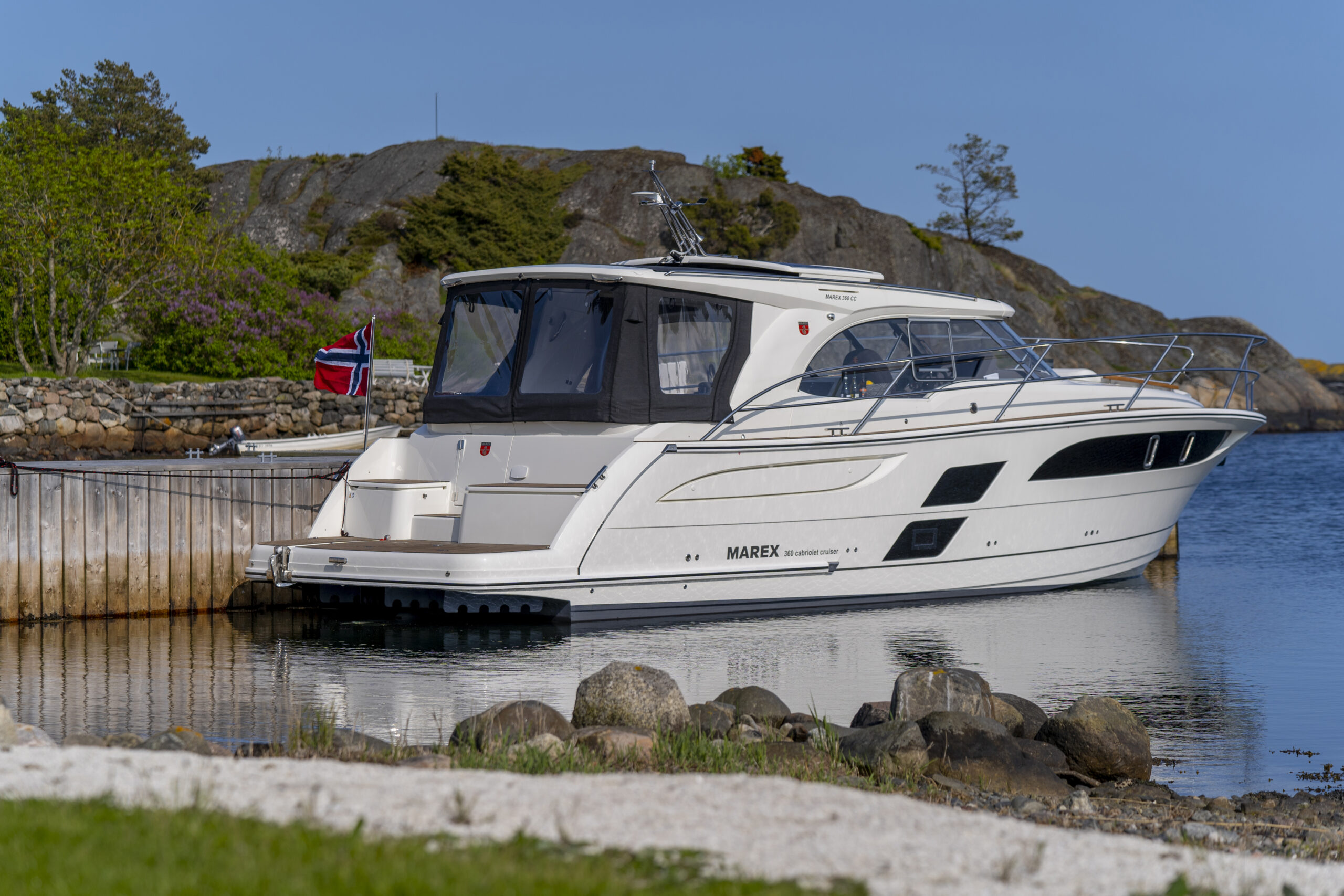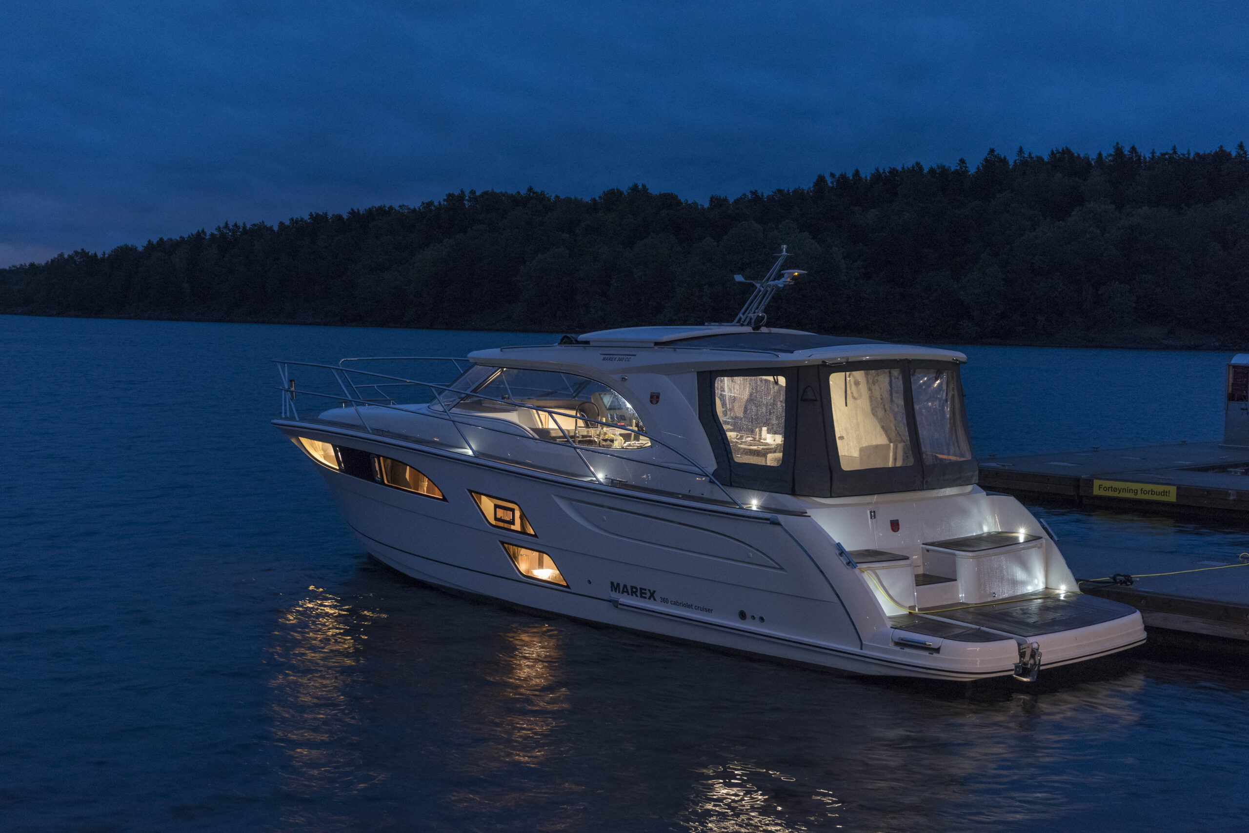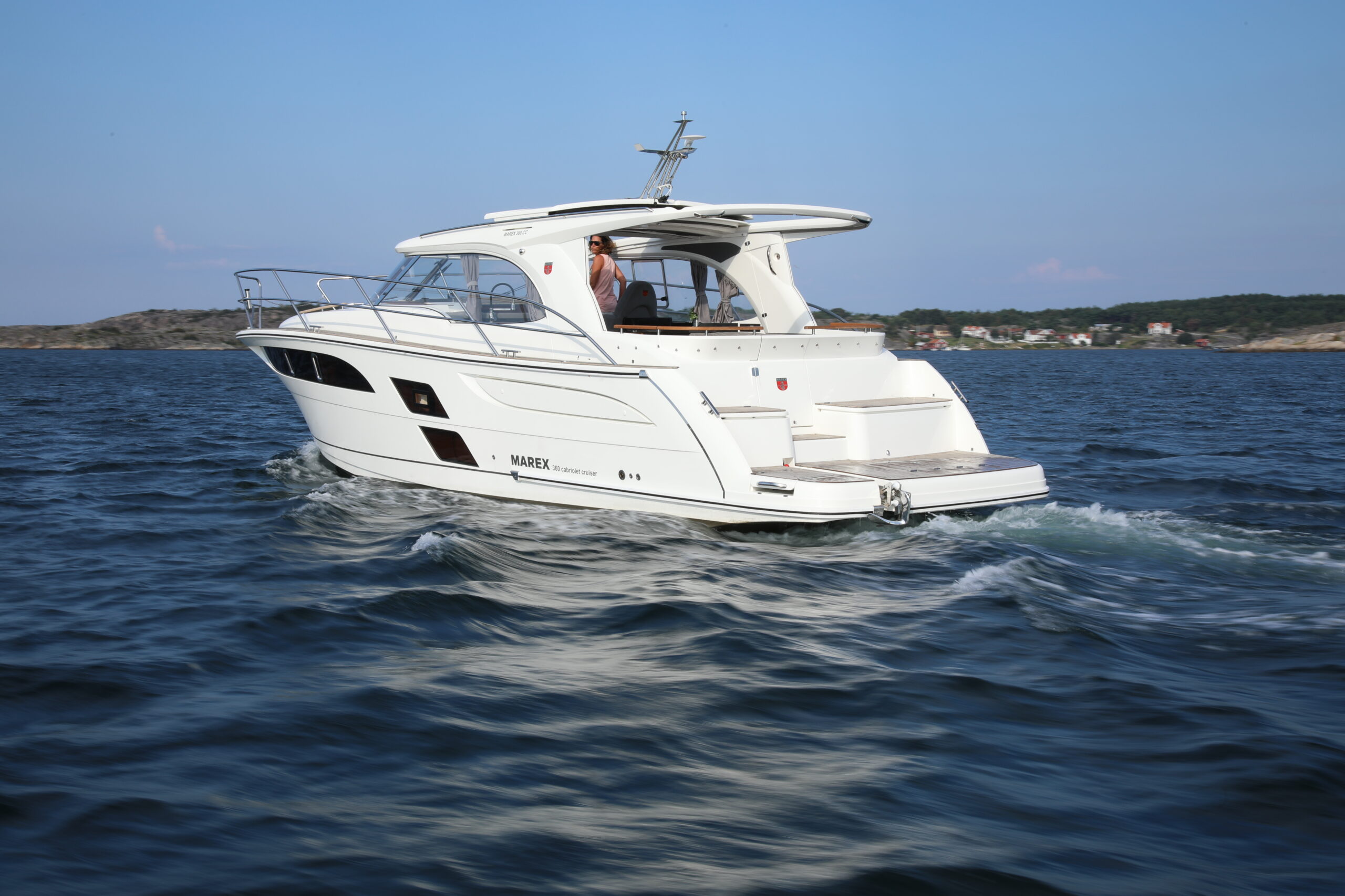 The Marex 360 Cabriolet Cruiser is well suited to coastal and inland cruising and features a wide range of comfort, amenities and innovative ideas. The ability to adapt to the environment flexibly makes the Marex 360 Cabriolet Cruiser a King of the Sea. Concept: The Perfect Party Cruiser The dynamic exterior of the Marex 360 СС was fashioned by the best designers and constructors - nature itself. Often harsh, rapidly changing Scandinavian weather and short-term warm days dictated the hull’s design. The boat features one of the largest convertible cockpits in its class that can become a perfect place for sunbathing, sharing a meal, or throwing a party at sundown. Swim Platform As several marinas and lakes restrict boat size, the 360 CC can be delivered with either a long or a short swim platform. The 2.3 and 4 Ft. platforms allow one to choose the boat's length of 36 or 37.7 Ft. Thanks to a hidden Davit’s solution, the lift tender onto the platform is an easy task. Moving the ladder to the portside allows to have permanent access to it. Benches on the platform serve as a place for relaxation and provide plenty of storage compartments, including space for eight fenders.