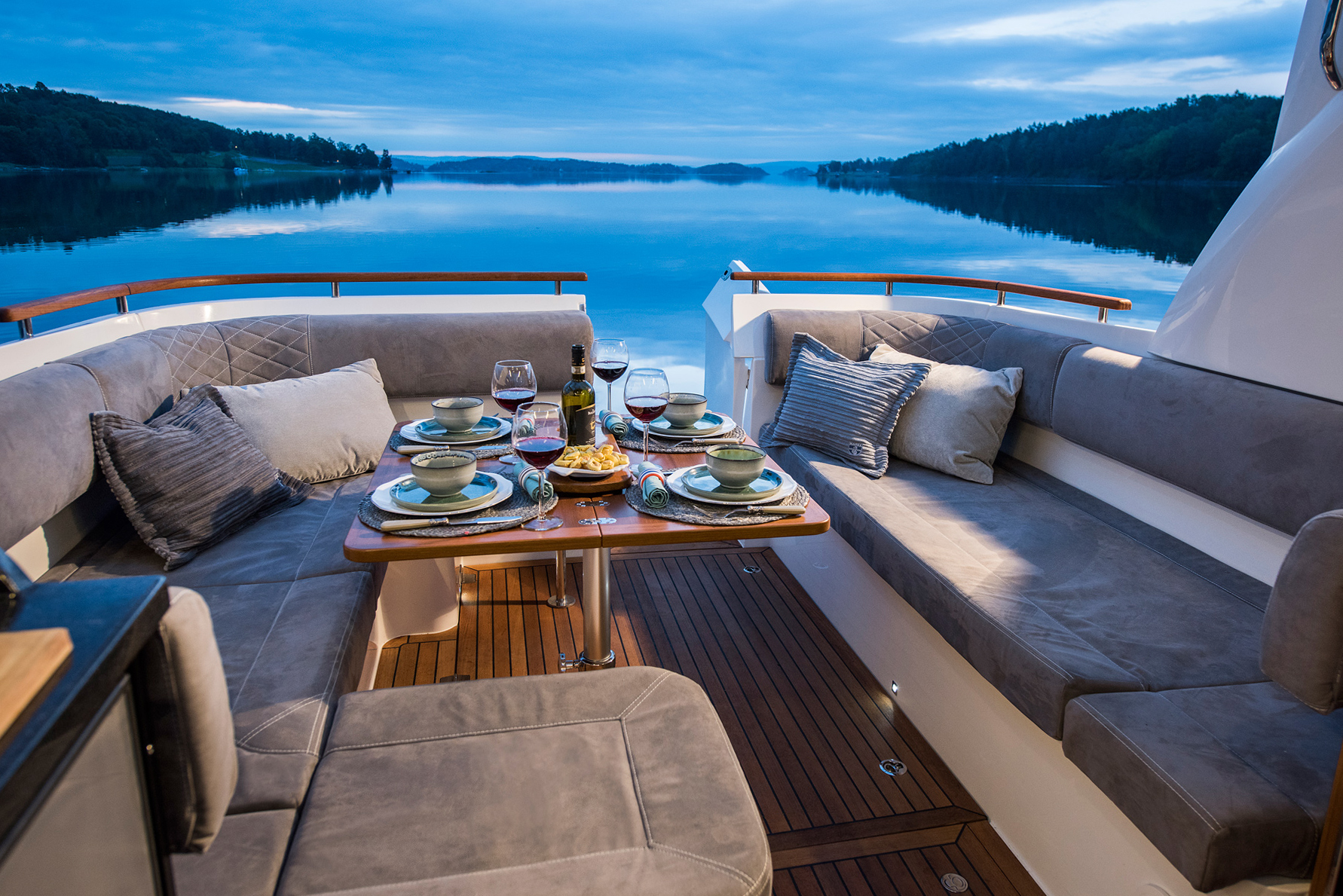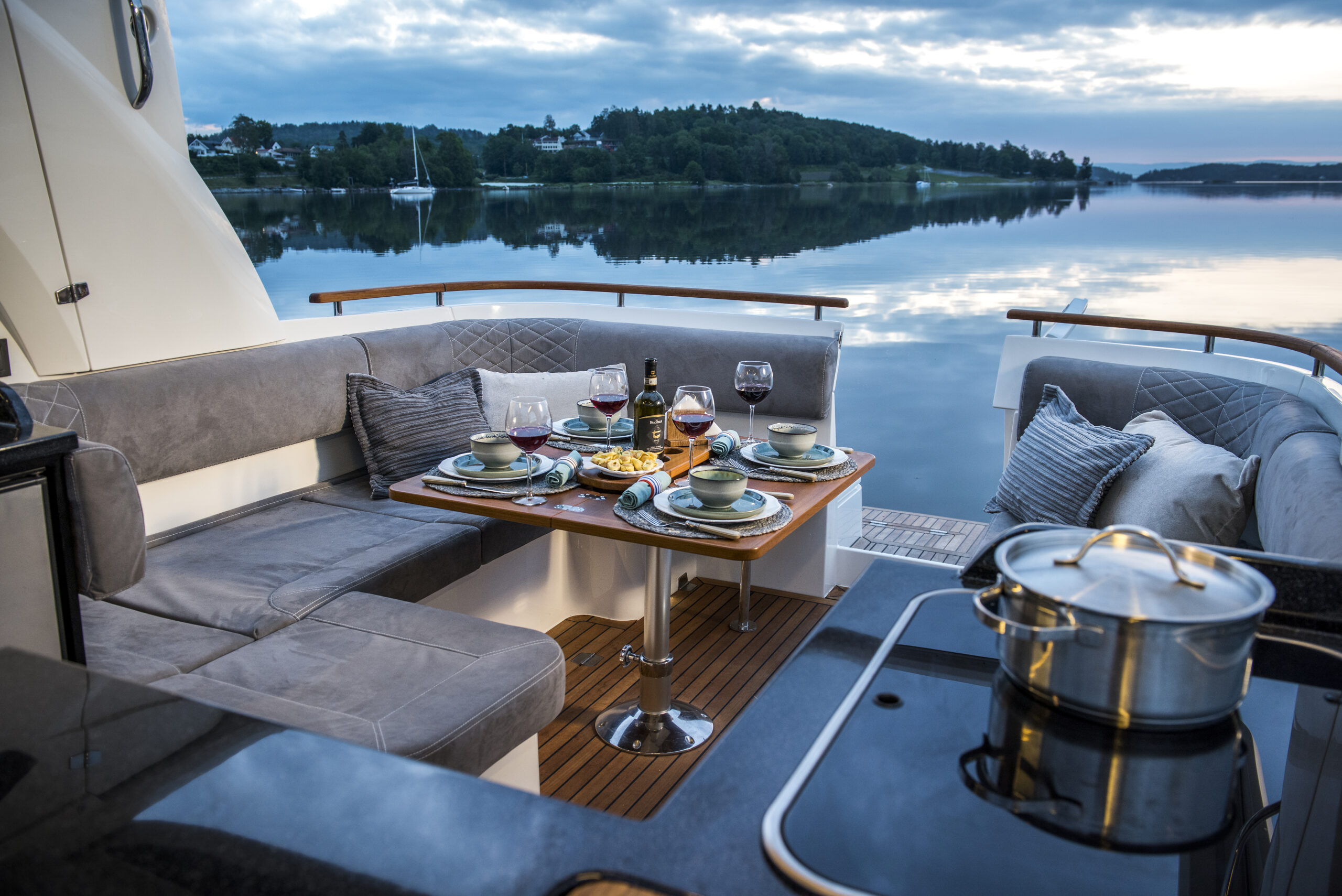 The use of natural materials in the interior of the boat, such as teak wood, adds warmth and a homey feeling to the interior of the 360 CC – you can especially feel it on the lower deck where you can find generous accommodation. In addition, there is a spacious bathroom in which it has a separate shower cabin with a bench. The master forward cabin features a double bed, plenty of storage space and a high ceiling of 6.3 Ft. The midship cabin features a double bed, full-height wardrobe and comfy sofa in the entrance zone. Both cabins are bathed in natural light courtesy of the large deck windows.