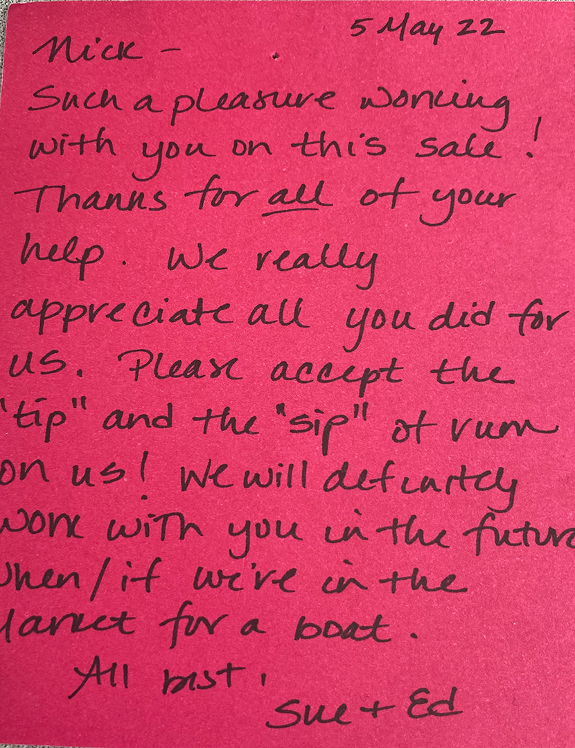 Such a pleasure working with you on this sale! Thanks for all of your help. We really appreciate all you did for us. Please accept the “tip” and the “sip” of rum on us! We will definitely work with you in the future when/if we’re in the market for boat.